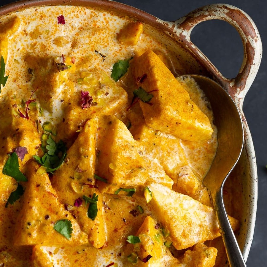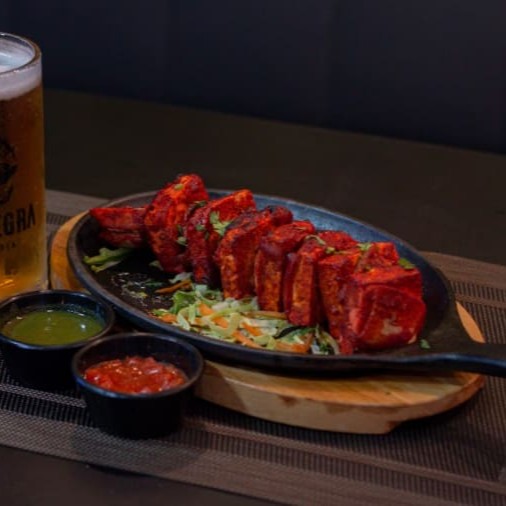 Pedaços de Ricota marinado e assado em forno Tandoor com molho de cebola, tomate, alho e especiarias indianas.