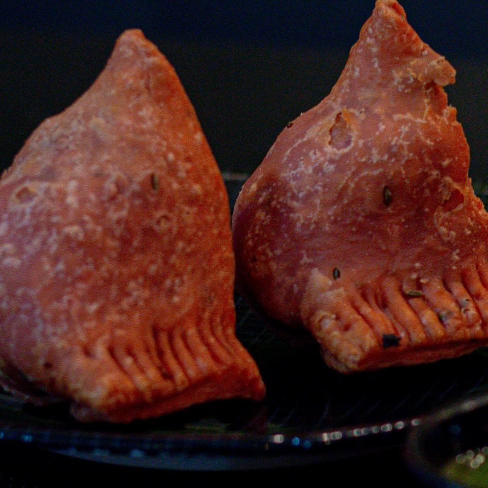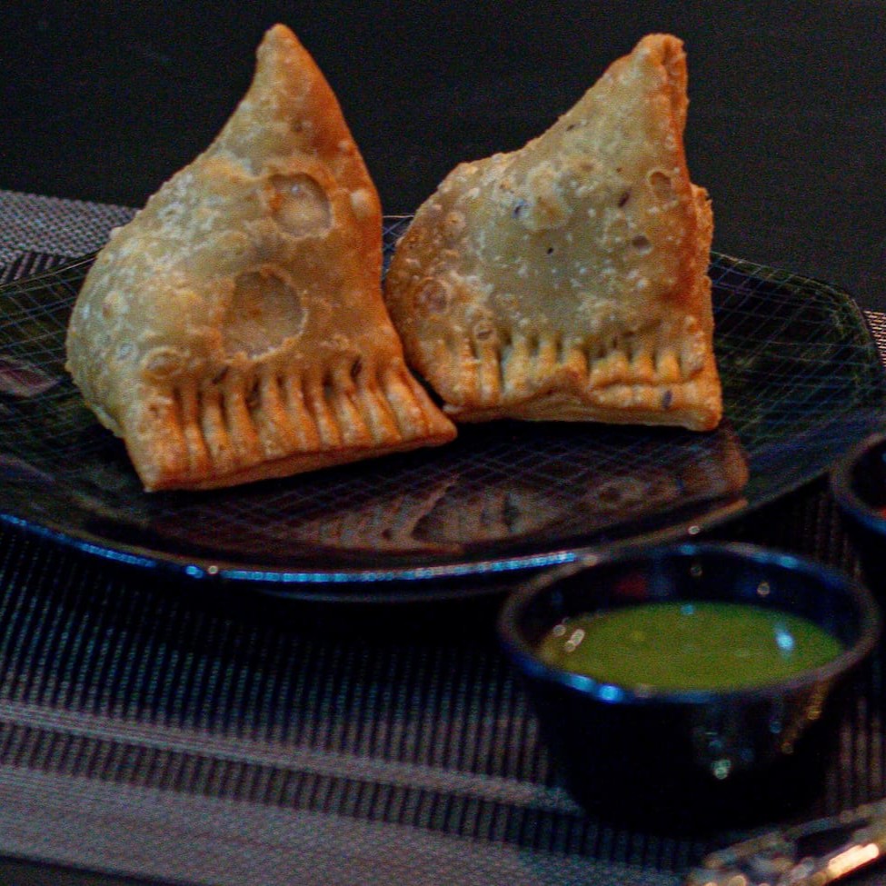 Tradicionais pastéis indianos recheados com batata, ervilha, uvas passas e temperados com masala. ( 2 Pcs )