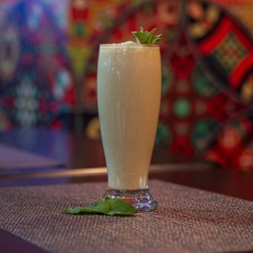 O nosso Pudina Lassi consiste em uma mistura de iogurte, água, especiarias, hortelã e sal.