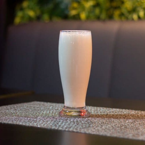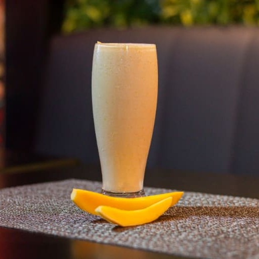 O nosso Lassi de manga consiste em uma mistura de iogurte, água, especiarias e manga.