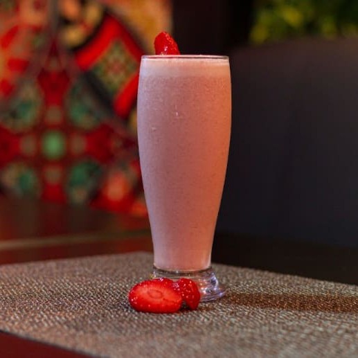 O nosso Lassi de morango consiste em uma mistura de iogurte, água, especiarias e morango