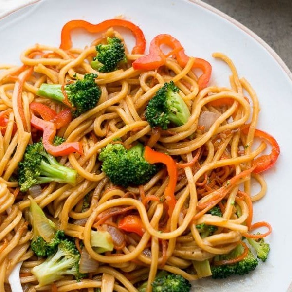 Receita indochinesa de macarrão frito com legumes e temperado com alho, gengibre e shoyu.