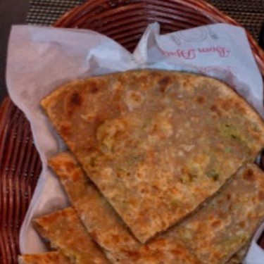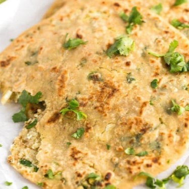 Pão indiano com farinha integral e recheio de couve-flor com temperos asiáticos e finalizado na chapa com manteiga.