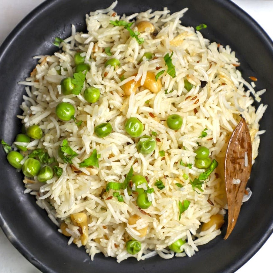 Ervilhas e cogumelos champignon com molho cremoso de cebola, tomate, alho e castanha de caju. Finalizado com temperos indianos.