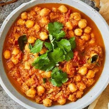 Grão-de-bico cozido no molho de tomate com cebola, alho, gengibre e especiarias indianas.