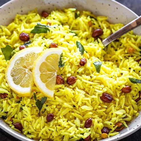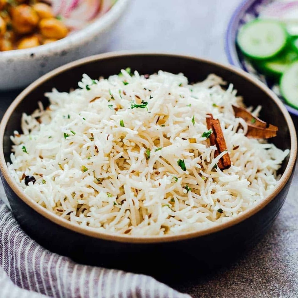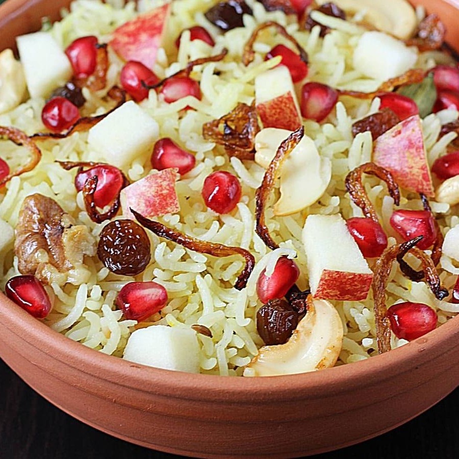 Arroz basmati preparado com especiarias, legumes salteados e frutas secas.