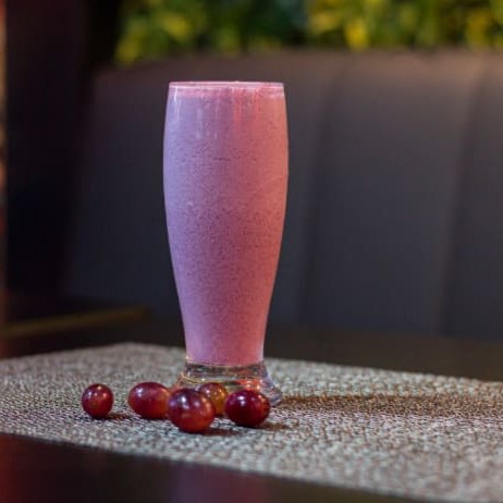 O nosso Lassi de uva consiste em uma mistura de iogurte, água, especiarias e uva