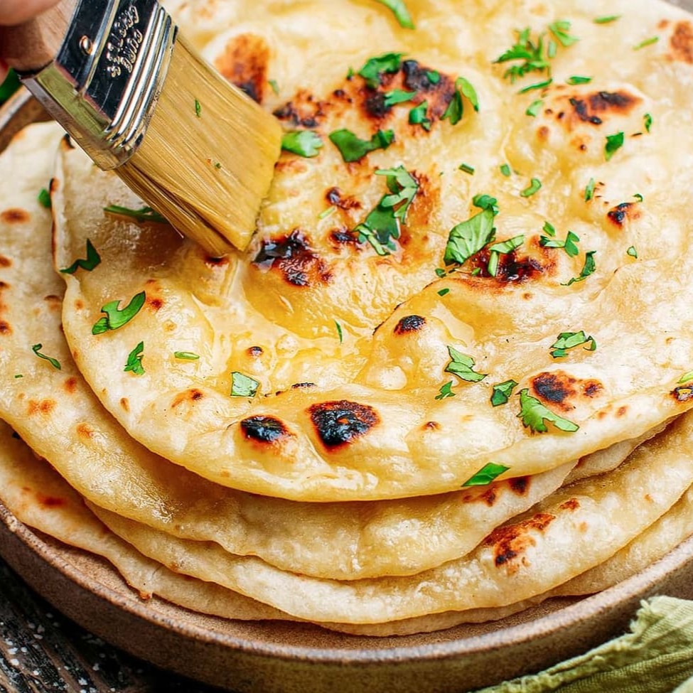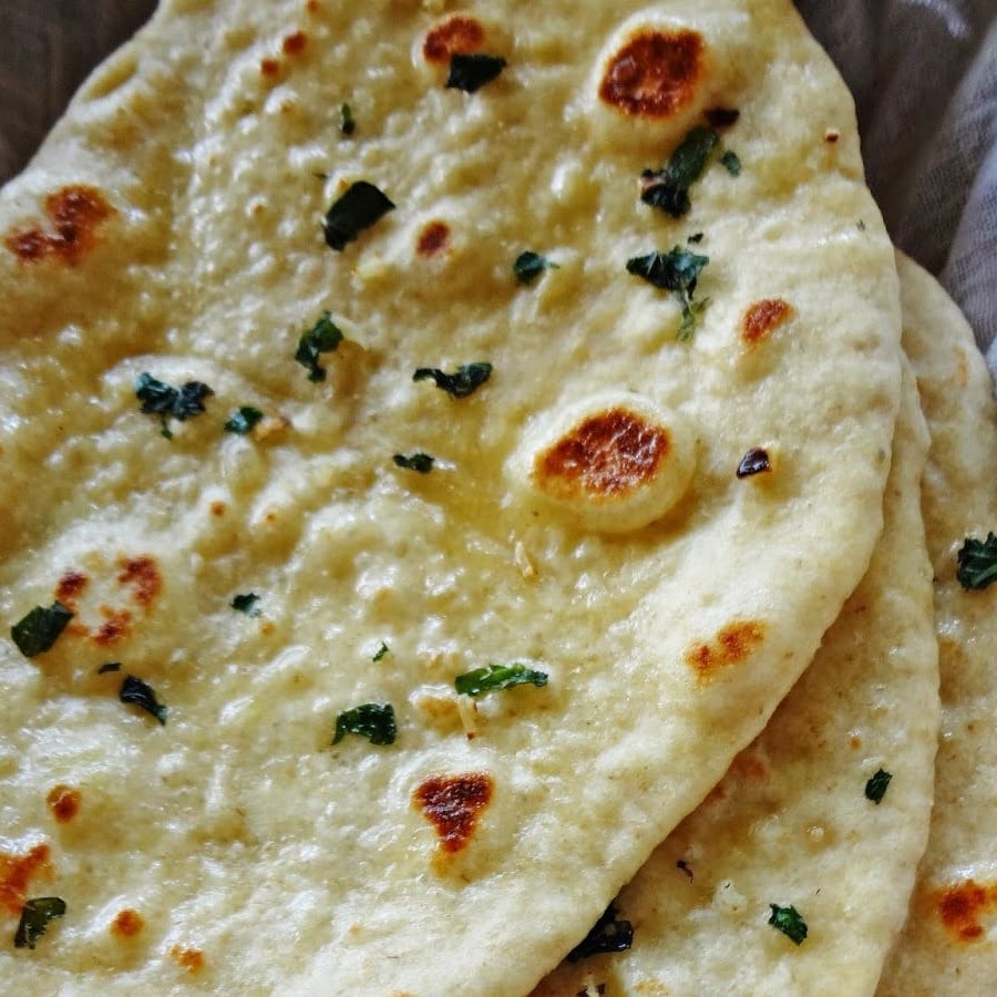 Pão indiano feito com farinha de trigo e fermento. Assado na hora no Tandoor.