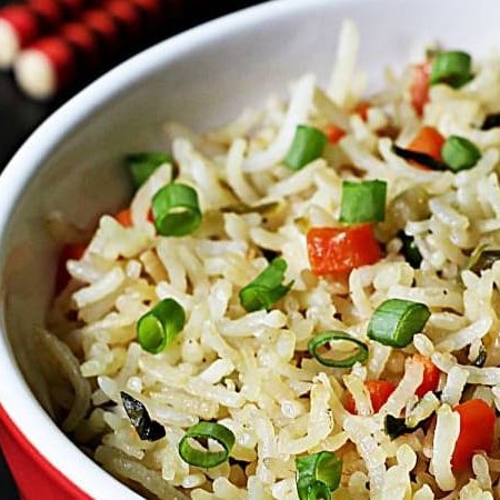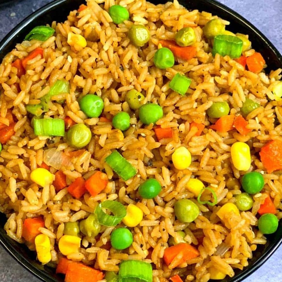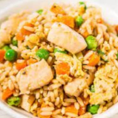 Arroz temperado com vários tipos de legumes e com uma essência de alho, gengibre, shoyu e pimenta de reino em pó.