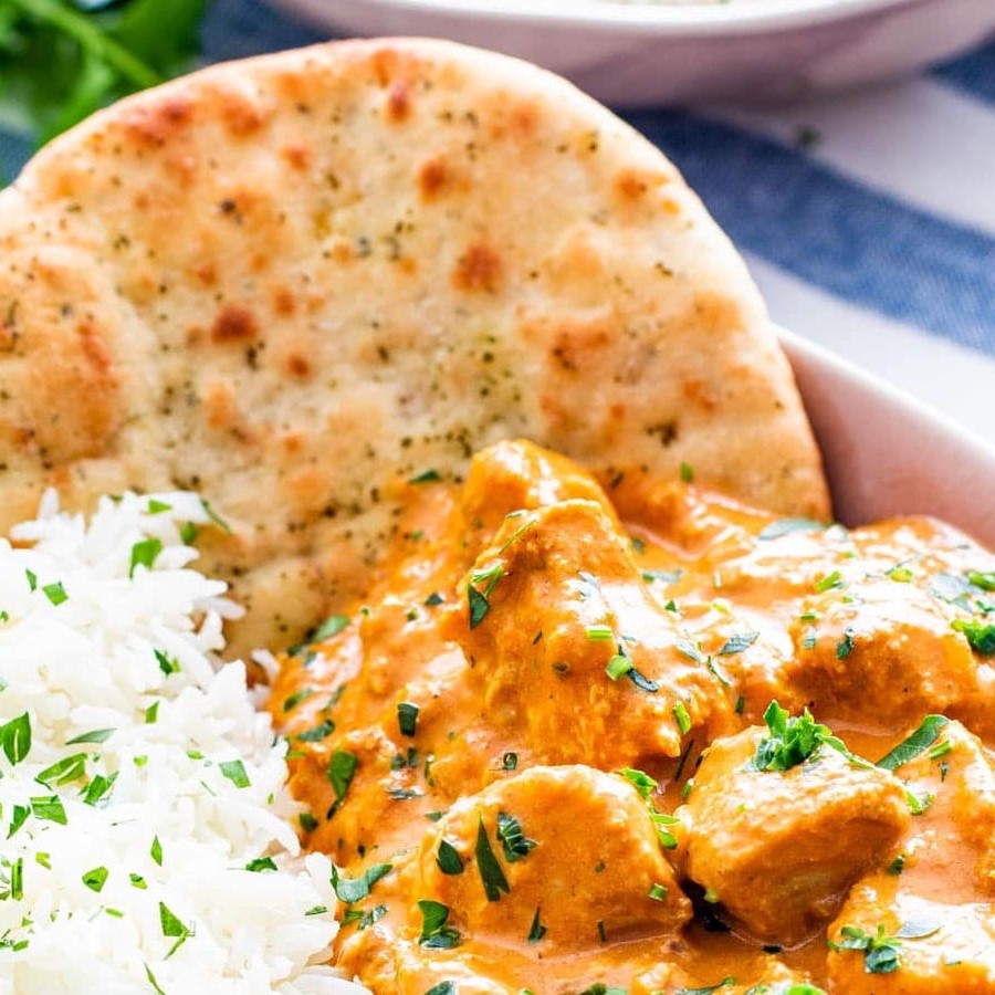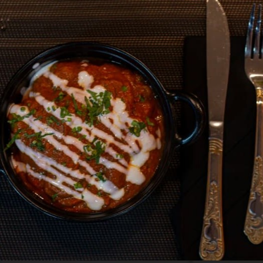Pedaços de frango assados no forno tandoor e finalizados com molho de tomate, cebola, alho, gengibre e especiarias indianas.