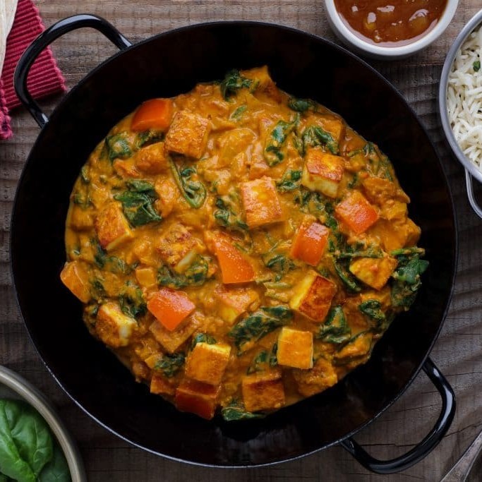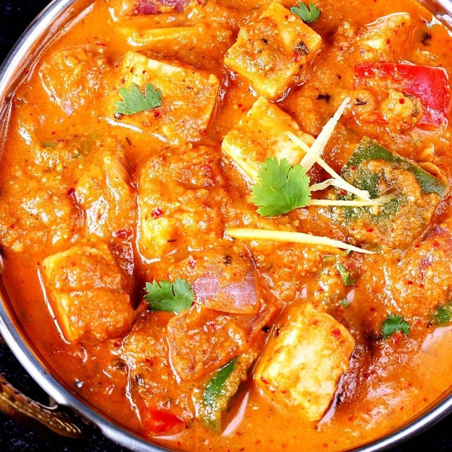 Pedaços de ricota, cebola e pimentão verde com molho picante de cebola, tomate e especiarias indianas.