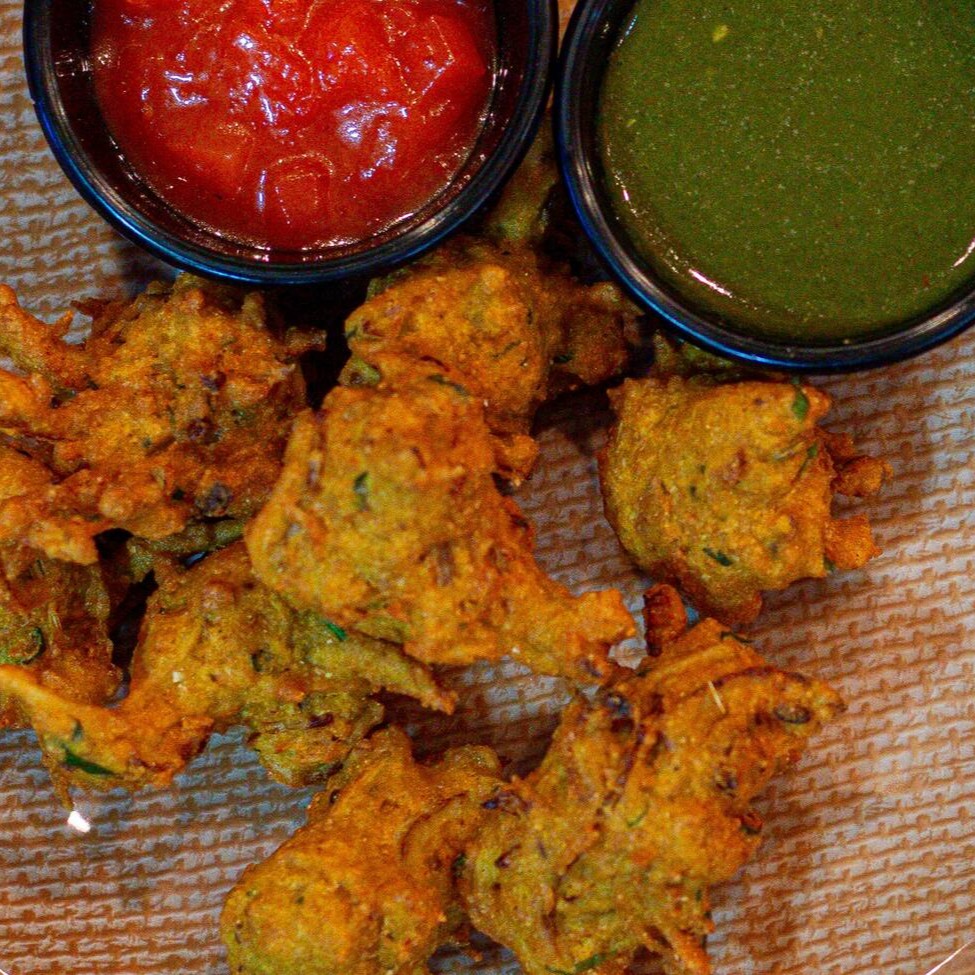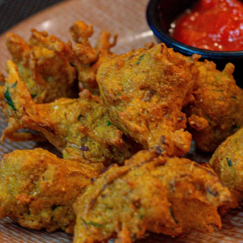 Pedaços de cebola e batata que são empanados na farinha feita de grão-de-bico, tipo tempura.