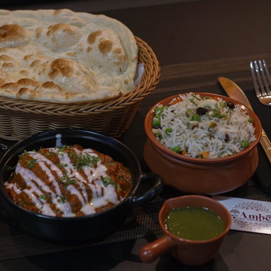 Butter Chicken-Frango marinado no iogurte e praparado com molho de tomate,cebola,castanha de caju,creme de leite e especiarias indiana.. Zeera Rice-Arroz basmati com especiarias indianas. Butter Naan-Pao indiano feito com farinha de trigo e fermento assado na hora no tandoor.