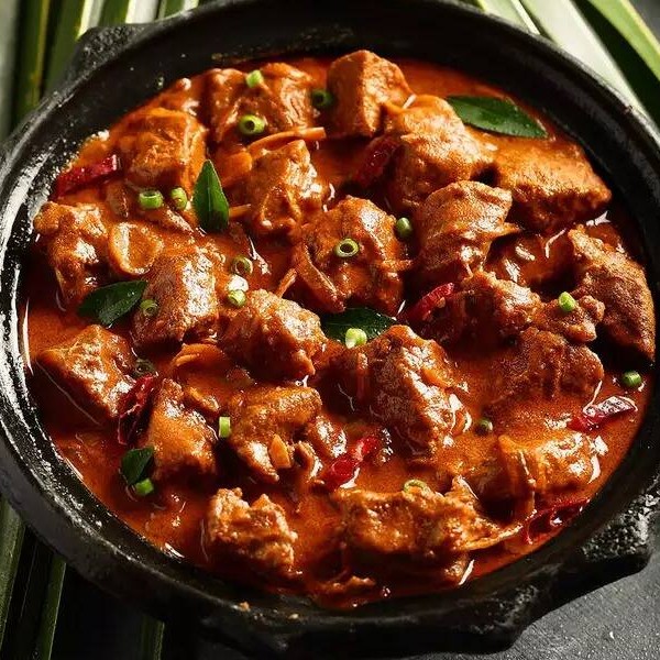Pedaços de Carneiro em molho cremoso preparado com coco, Cravo da Índia, pimenta do reino, cebola, tomate, alho e especiarias asiáticas.