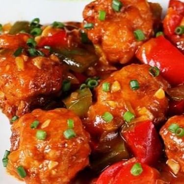 Pedaços de frango feitos com pimentões e cebolas finalizados no molho de tomate e especiarias asiáticas.