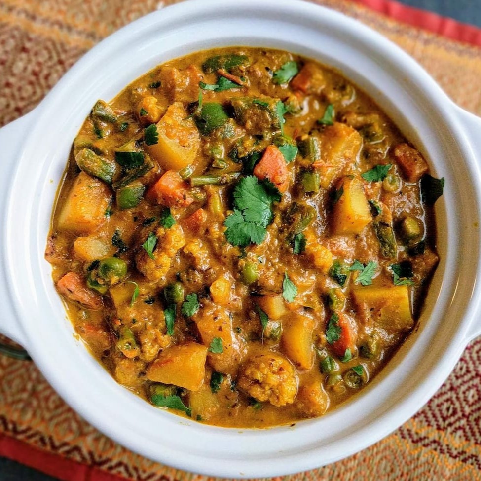 Curry contendo couve-flor, batata, ervilhas, tomate e finalizado com especiarias.