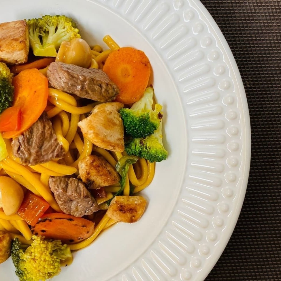 Pedaços de patinho, peito de frango, legumes frescos, molho shoyu e redução de aceto balsâmico. Preparado por chefes asiáticos, levando a típica experiência até sua mesa.