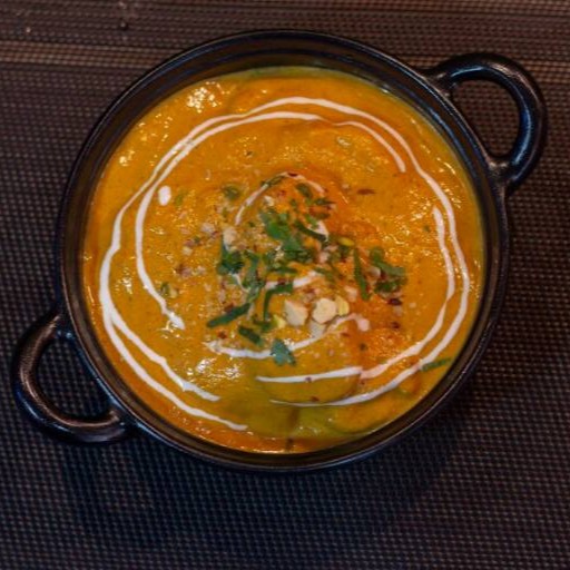 O prato mais rico na Índia. Pedaços de frango feitos com molho branco de castanha de caju, creme de leite, amendoim e temperos indianos.