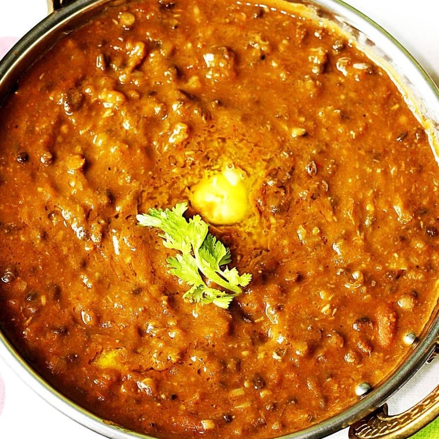 Lentilha e feijão cozido no ghee com cebola, tomate, alho, gengibre e especiarias.