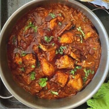 Pedaços de peito de frango cozidos em um molho preparado com cebola, tomate, alho, gengibre e especiarias da Índia.