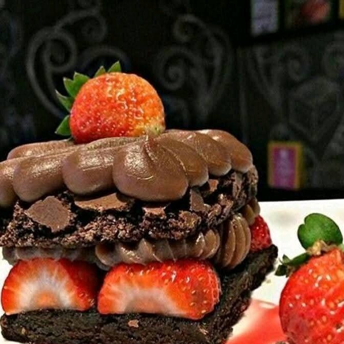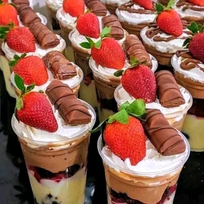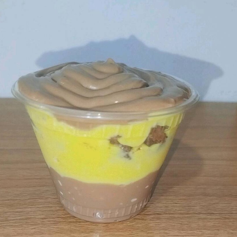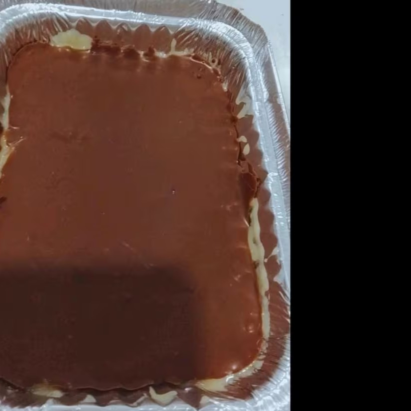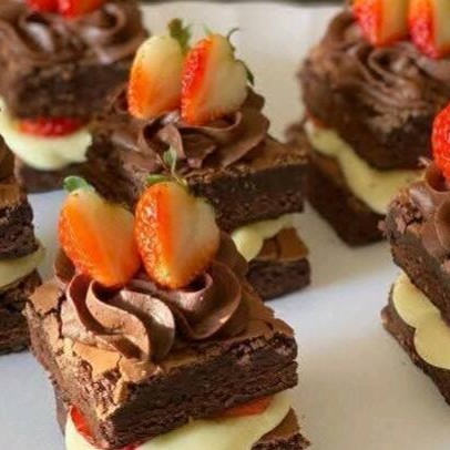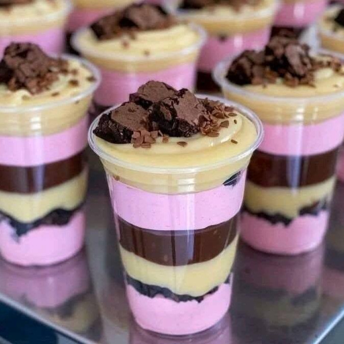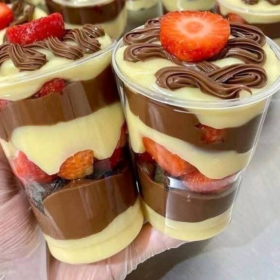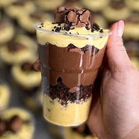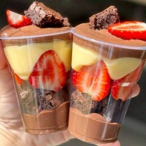 Uma camada de brigadeiro de chocolate com pedaços de brownie e morango picados e com brigadeiro cremoso de leite Ninho e finalizado com cremoso brigadeiro ao leite (250ml)