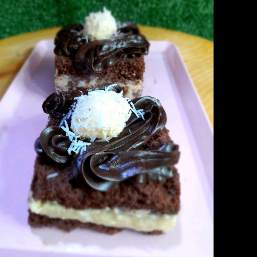Brownie com recheio de Prestígio e cobertura de chocolate meio amargo