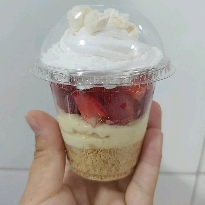 Camada de bolacha crocante com creme de Ninho morangos picados com chantilly e suspiros (180g)