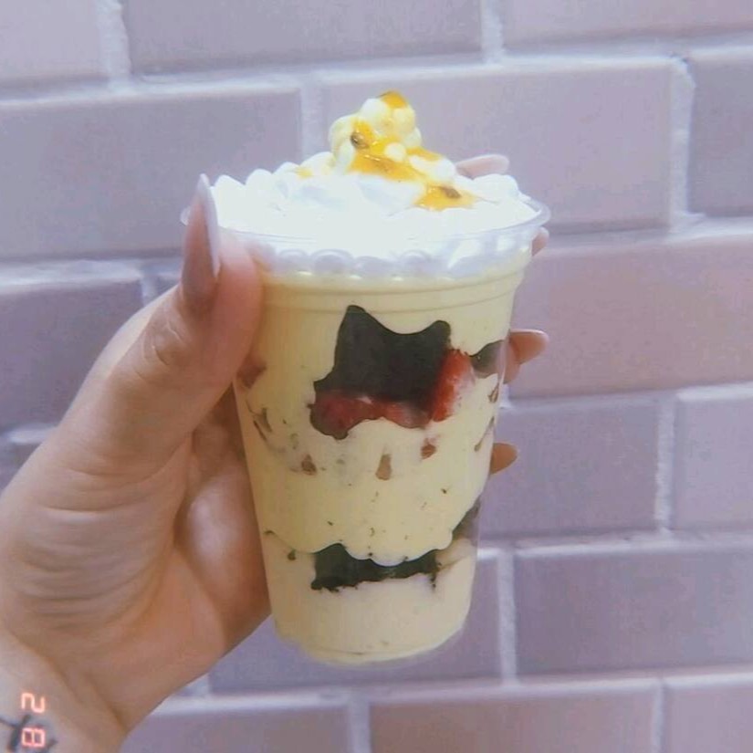 Camada de creme de chocolate branco com creme de maracujá pedaços de brownie e pedaço de morango finalizada com chantilly e geleia de maracujá...