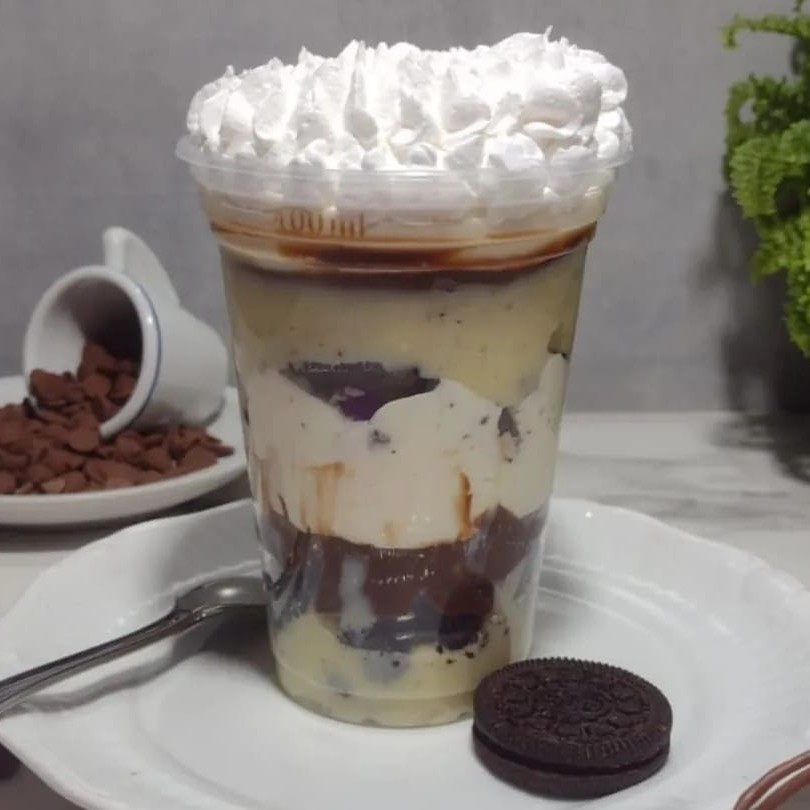 Camadas generosas de brigadeiro branco, brigadeiro de chocolate, pedacinhos crocantes de Oreo, creme de Ninho super cremoso e uma cobertura fofinha de chantilly para finalizar. Uma explosão de sabor e textura em cada colherada!