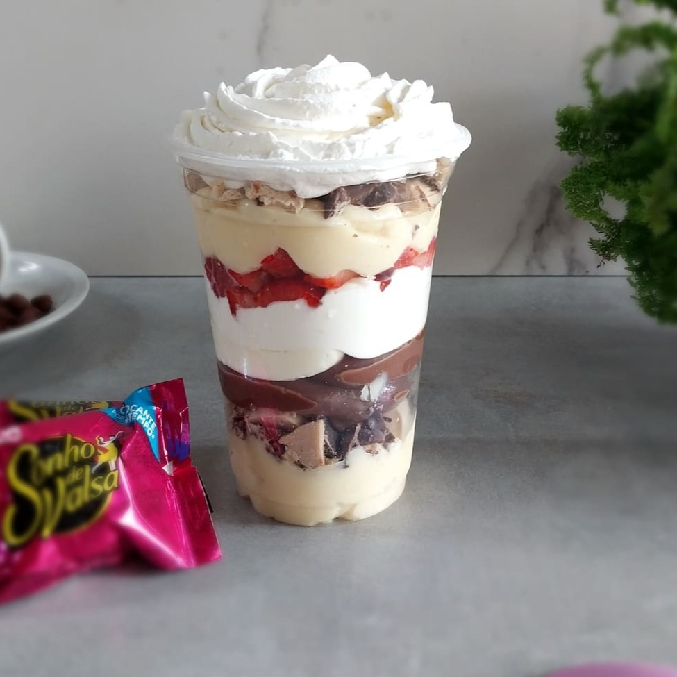 Camadas irresistíveis de brigadeiro branco, brigadeiro de chocolate e creme de Ninho super cremoso, com pedacinhos generosos de Sonho de Valsa que trazem crocância e muito sabor. Finalizado com chantilly fofinho, é uma verdadeira tentação para os apaixonados por chocolate.