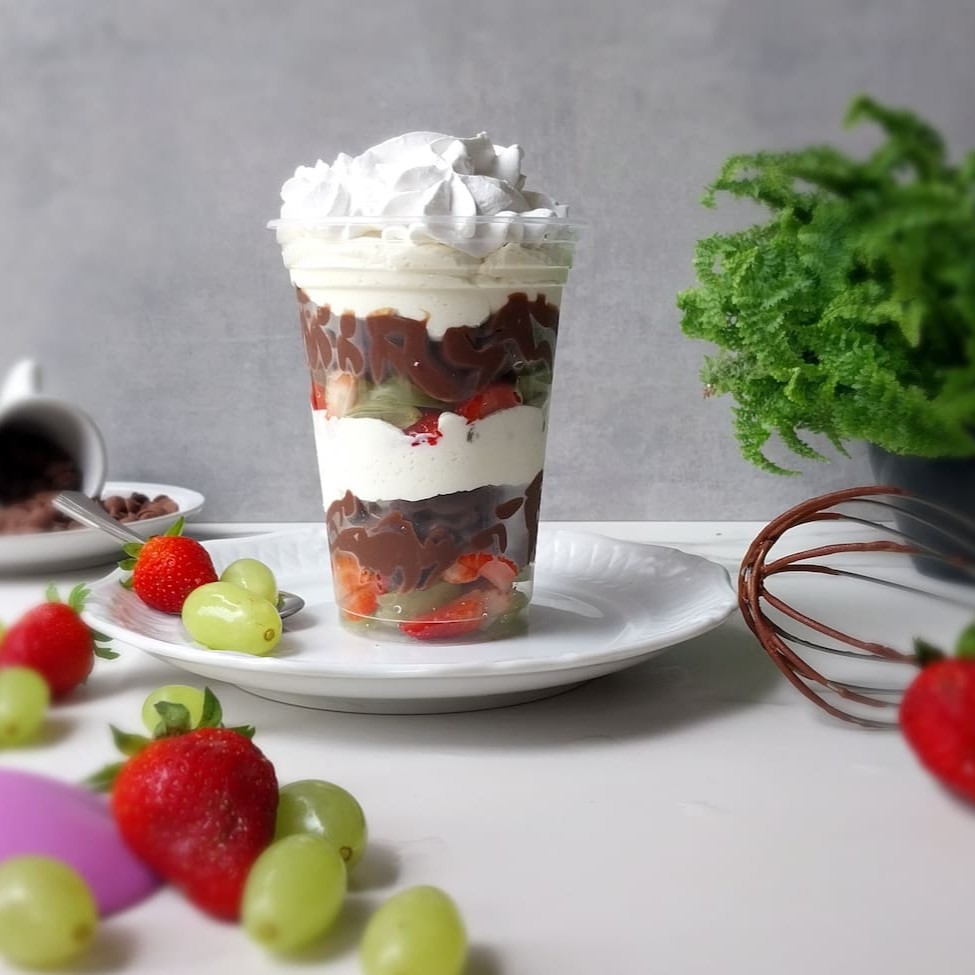 Um copo recheado de sabor: camadas de brigadeiro de chocolate, creme de Ninho cremoso, morangos suculentos e uvas fresquinhas. Finalizado com chantilly, é a combinação perfeita de doçura e frescor em cada colherada.