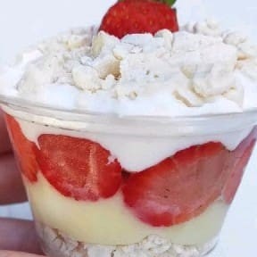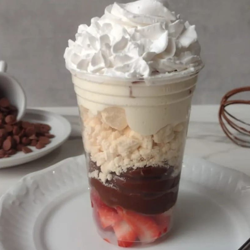 Camadas irresistíveis de brigadeiro de chocolate, suspiros crocantes, creme de Ninho e morangos frescos. Finalizado com chantilly fofinho e mais pedacinhos de morangos, é a combinação perfeita entre doçura, frescor e crocância.