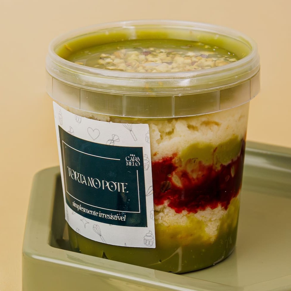 Uma incrível torta no pote que consegue ser simultaneamente bem molhadinha, extremamente cremosa e refrescantemente geladinha. É composta por uma massa branca, creme de brigadeiro de pistache, e geleia artesanal de frutas vermelhas que acrescenta uma doçura equilibrada e um maravilhoso toque de frescor. Uma verdadeira explosão de sabores em cada colherada! Aprox 230g.