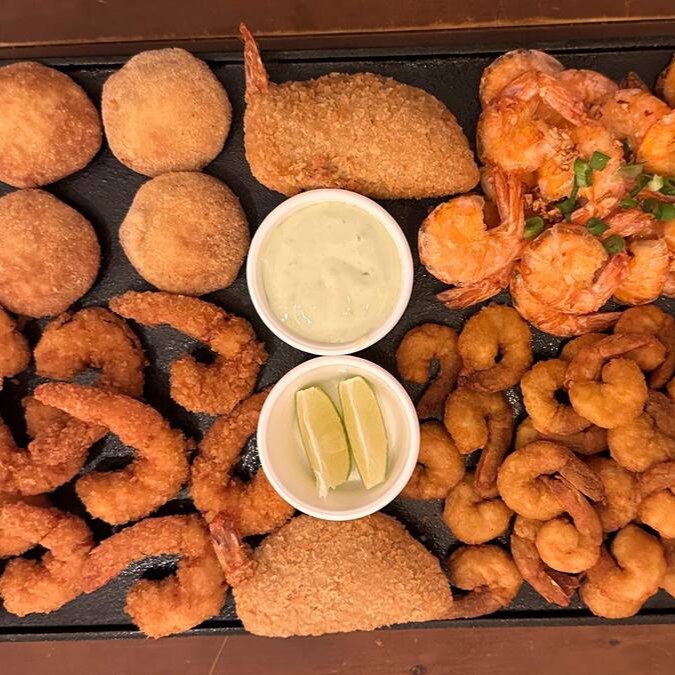 Camarão crocante na Panko (Eviscerado), 6 unidades mais bolinho de camarão, 2 unidades de camarão recheado com cream cheese, Camarão a milanesa e camarão Alho e óleo acompanha nossa maionese da casa.