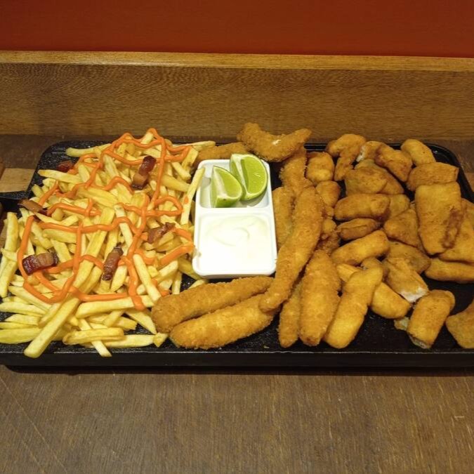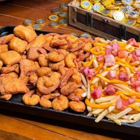 Deliciosa porção de Tilapia 250g mais Camarão 250g mais batata frita ou Polenta Gratinada 250g e bolinho de aipim5 00g (Carne seca ou Linguiça Blumenau ou Queijo).