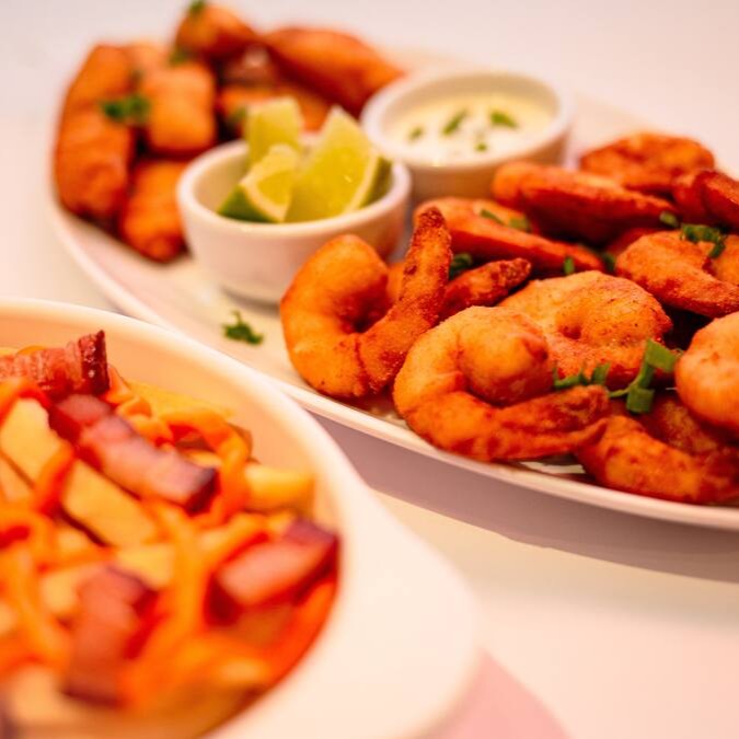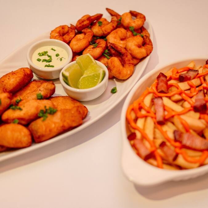 Tilápia 500g, Camarão 500g e Batata Bacon e cheddar ou Polenta Gratinada 500g acompanhado de nossa maravilhosa maionese da casa mais limão.