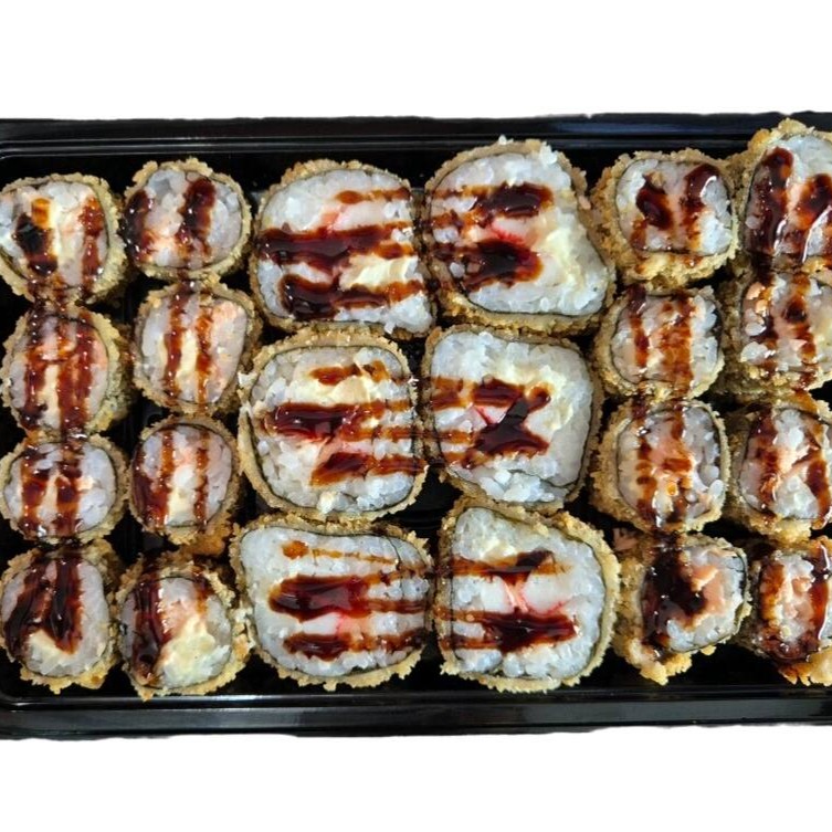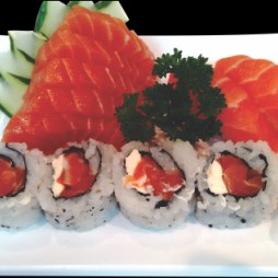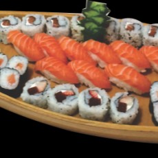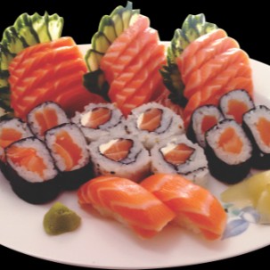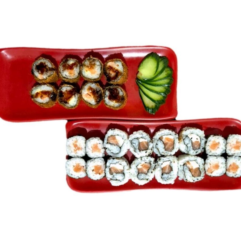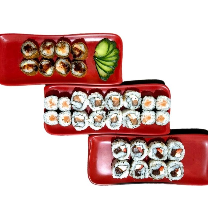 8 x uramakis filadélfia + 8 x uramakis goiabada + 8 x shakemaki salmão + 10 niguiris de salmão.
