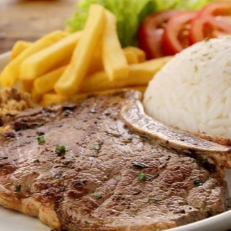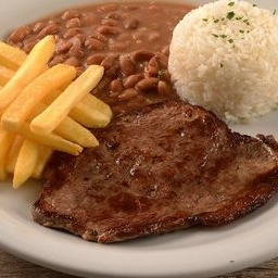 Bife grelhado de Miolo de Alcatra, arroz, feijão branco e batata frita ou polenta frita.