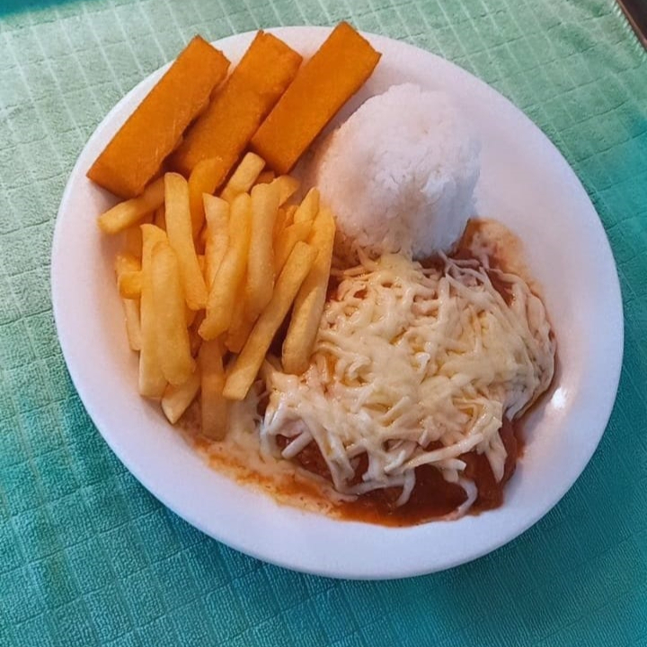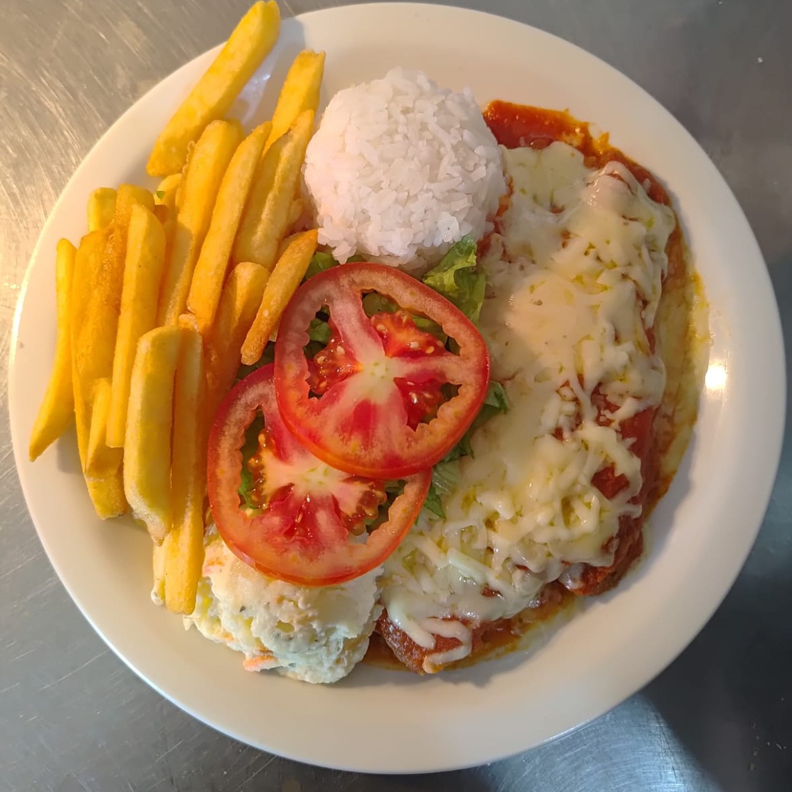 Filé de Frango coberto com molho vermelho da casa e queijo mussarela, arroz, feijão, salada, maionese e fritas ou polenta.