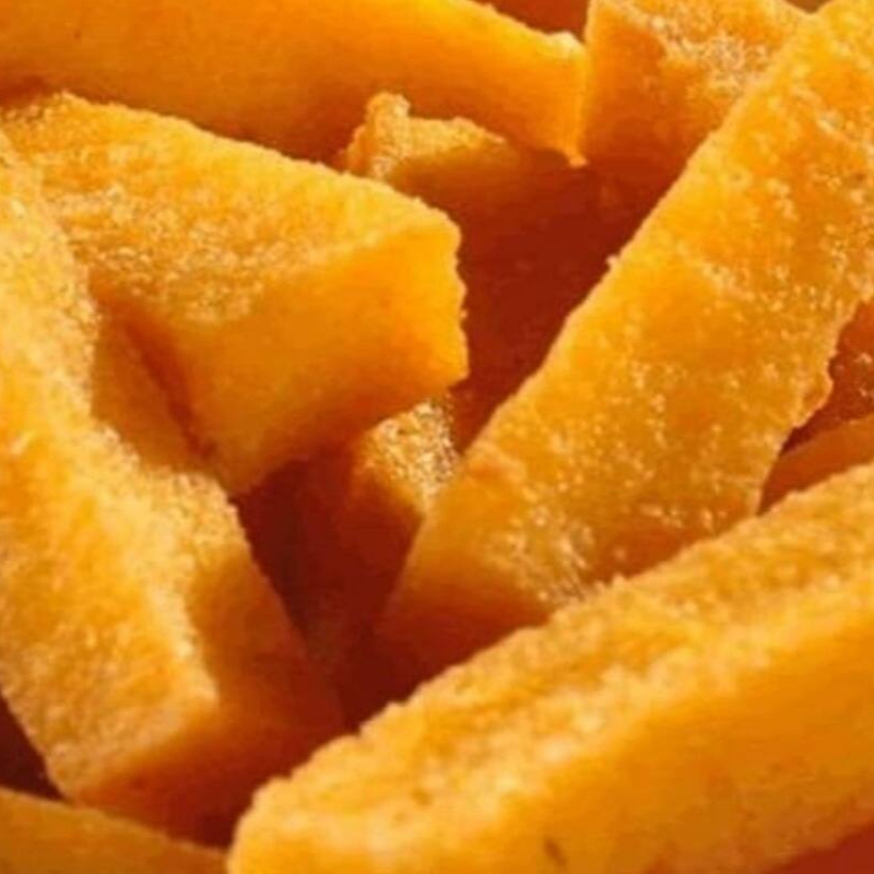 Fruta congelada e adoçado com açúcar ou adoçante.
