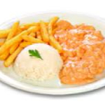 Strogonoff de frango, arroz, feijão branco e batata frita ou polenta.