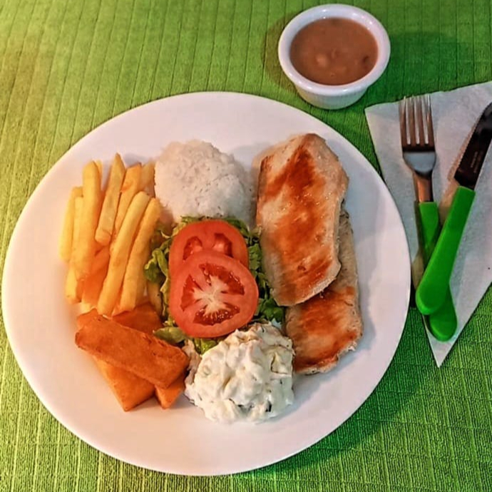 Filé de frango grelhado, arroz, feijão, salada, maionese e fritas ou polenta