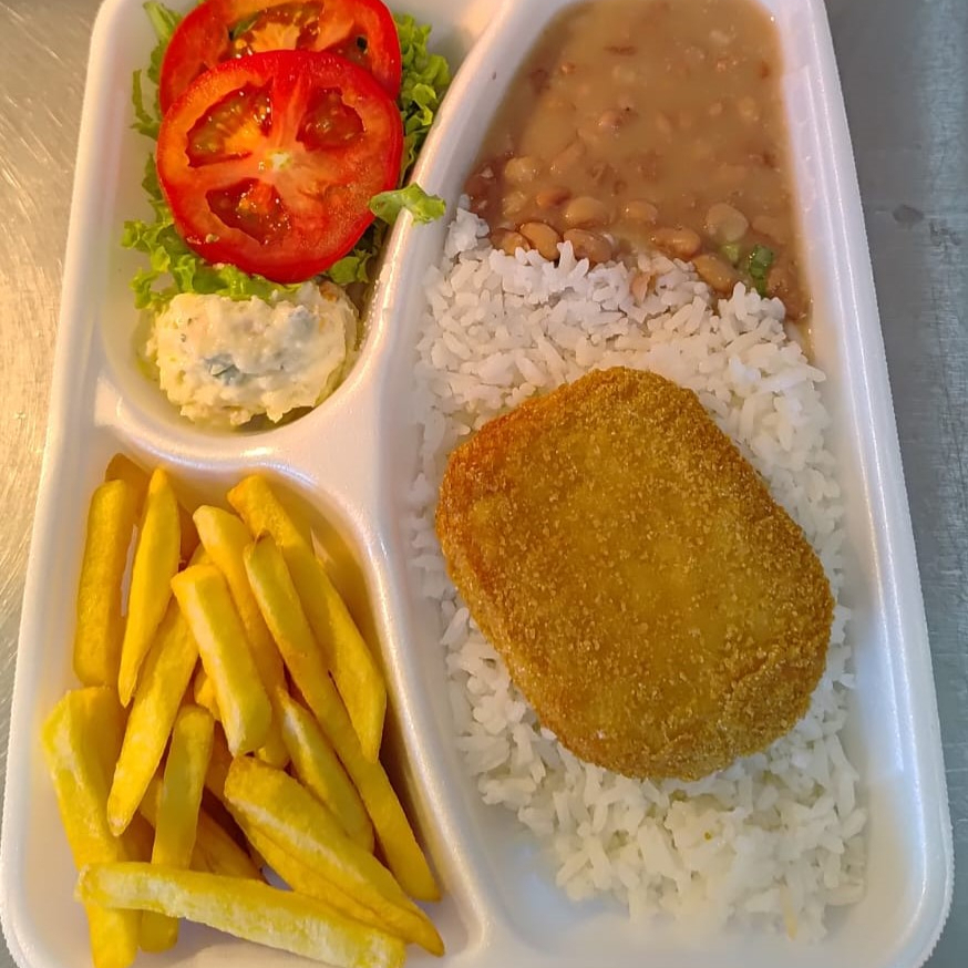 Filé de Tilápia acompanhado com arroz, feijão branco, maionese de batata caseira, alface, tomate e batata frita ou polenta frita.