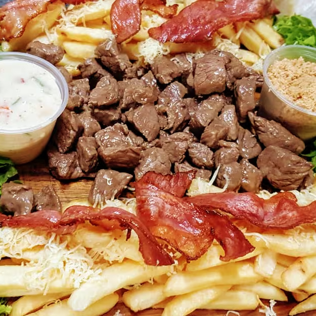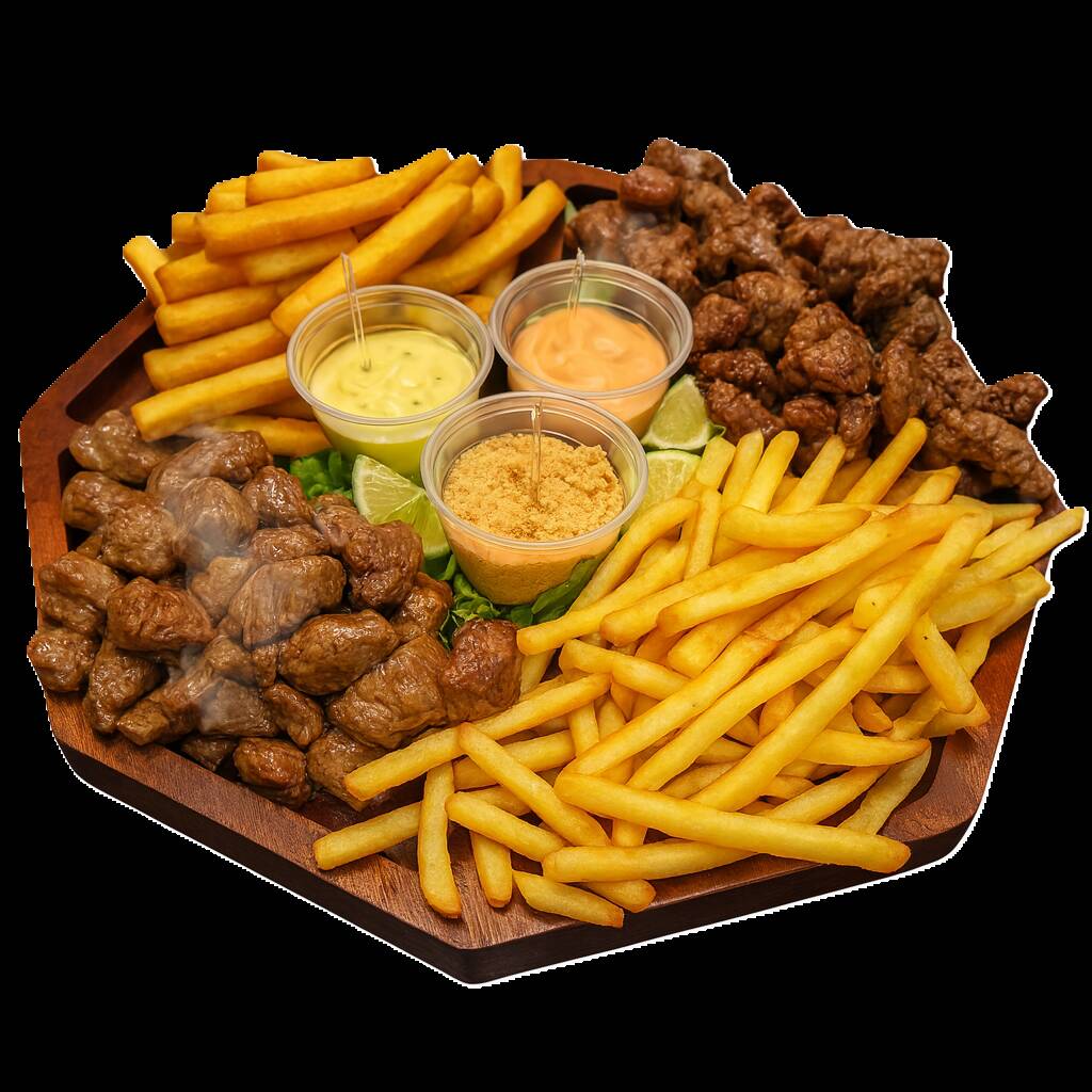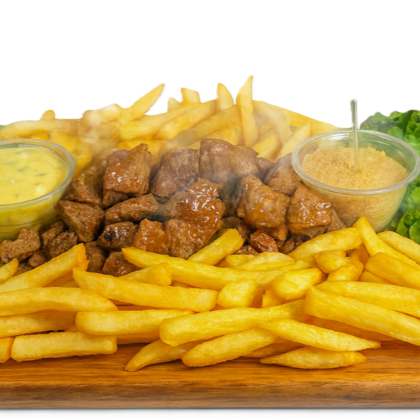 Alcatra de alta procedência cortada em cubos, marinado no tempero especial da casa com cebolinha verde, batata frita com queijo provolone ralado e bacon tostado. Acompanha molho tártaro e farofa de alho.