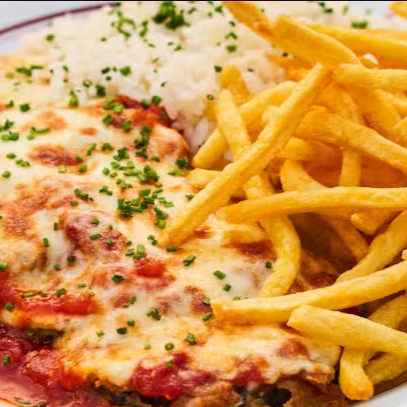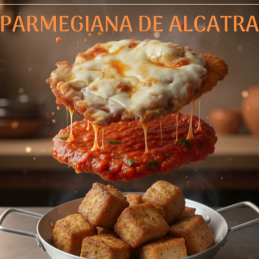 Alcatra à Parmegiana é uma opção de refeição completa, saborosa e única na região. Cubos suculentos de alcatra nobre são empanados artesanalmente, fritos até ficarem dourados e crocantes, e então cobertos com um molho de tomate caseiro, encorpado e cheio de sabor, finalizados com duas fatias de queijo derretido e gratinado no ponto certo. Para acompanhar, um prato completo: arroz branco soltinho, batata frita crocante feita na hora e uma salada fresca de alface e tomate. Uma refeição pensada para quem quer fugir dos lanches e curtir uma refeição de verdade, com sabor caseiro e ingredientes de qualidade. Exclusivo no nosso cardápio!