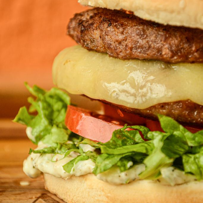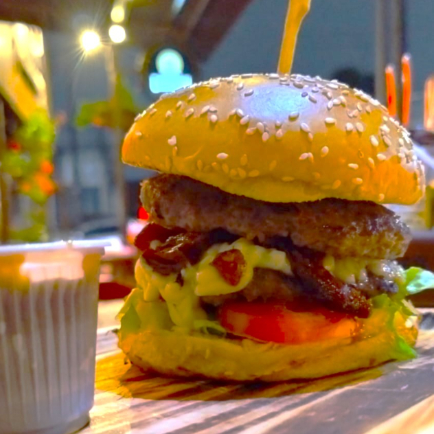 Este prato apresenta um pão artesanal perfeitamente assado, abrigando um bolinho grelhado e suculento de carne moída, meticulosamente misturada com bacon moído, e generosamente recheado com queijo muçarela derretido. É elegantemente adornado com uma maionese caseira, cuja receita é tesouro de família da Vó Luíza, frescas folhas de alface e fatias de tomate maduro. O prato é harmoniosamente finalizado com um toque de molho barbecue artesanal, oferecendo um contraste de sabor inesquecível.
