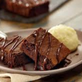 Brownie cremoso de chocolate, coberto com calda de chocolate e cereja, sorvete de creme com calda de morango.