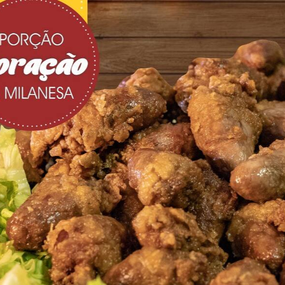 Porção de coração marinado ao tempero especial da casa, feito a milanesa no trigo. acompanha molho rose e molho tártaro.