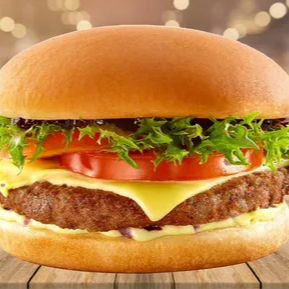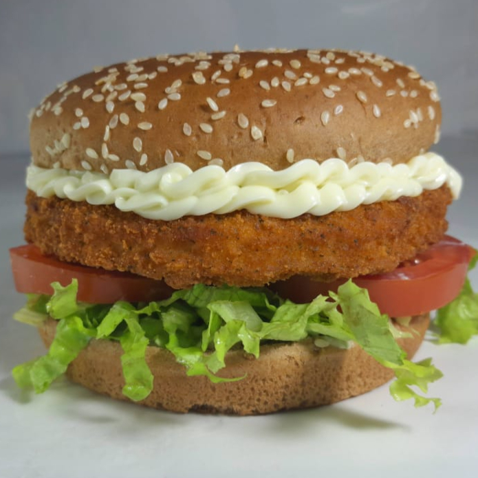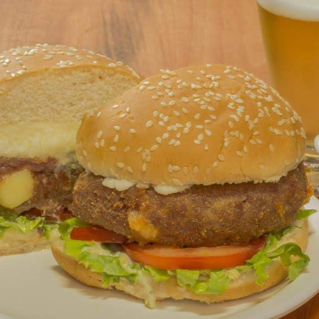Pão artesanal, bolinho vegetariano (sem nada de origem animal) coberto por queijo duplo, maionese caseira, alface e tomate. Acompanha molho tártaro.