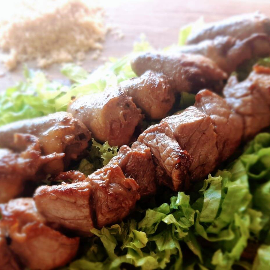 Espetinho de alcatra macia, intercalado com cebola e pimentão, grelhado ao ponto.